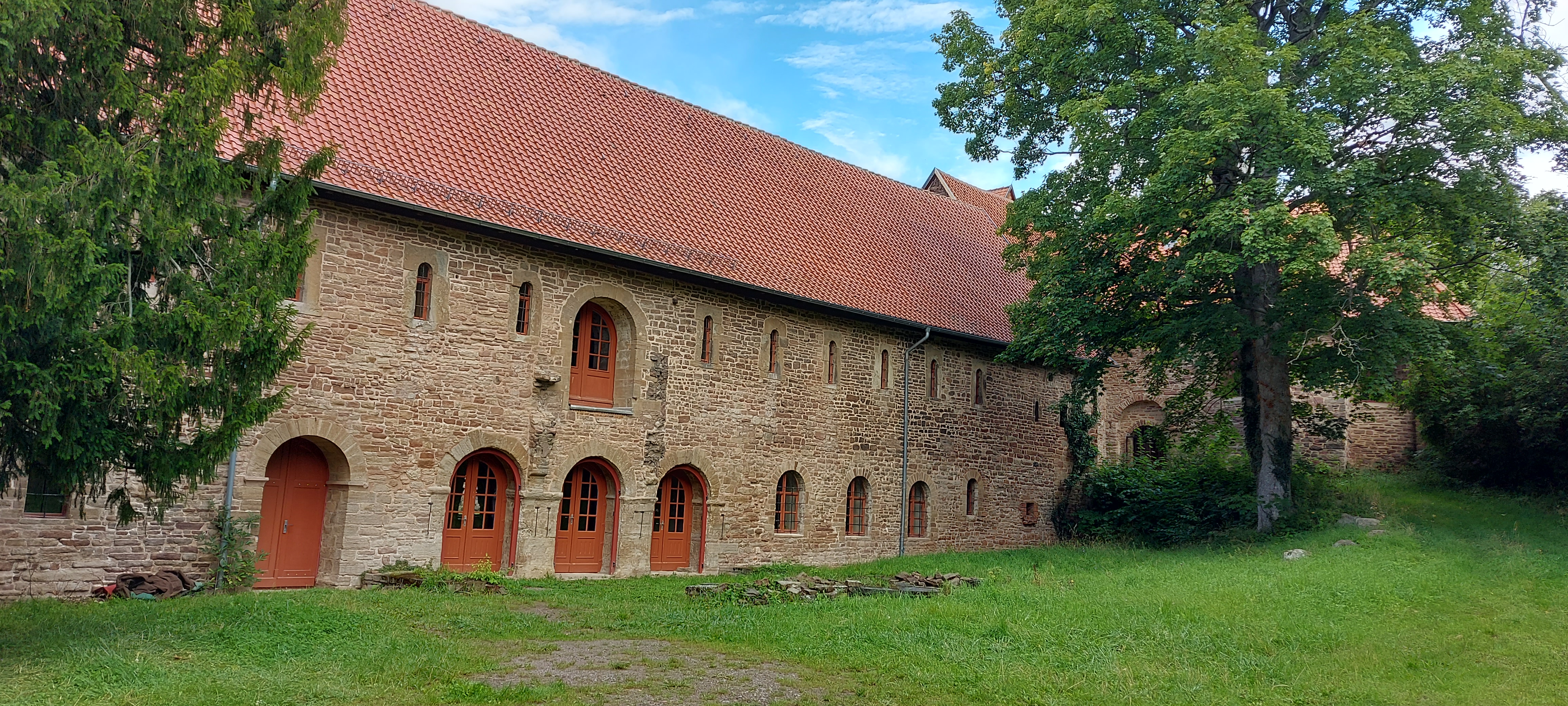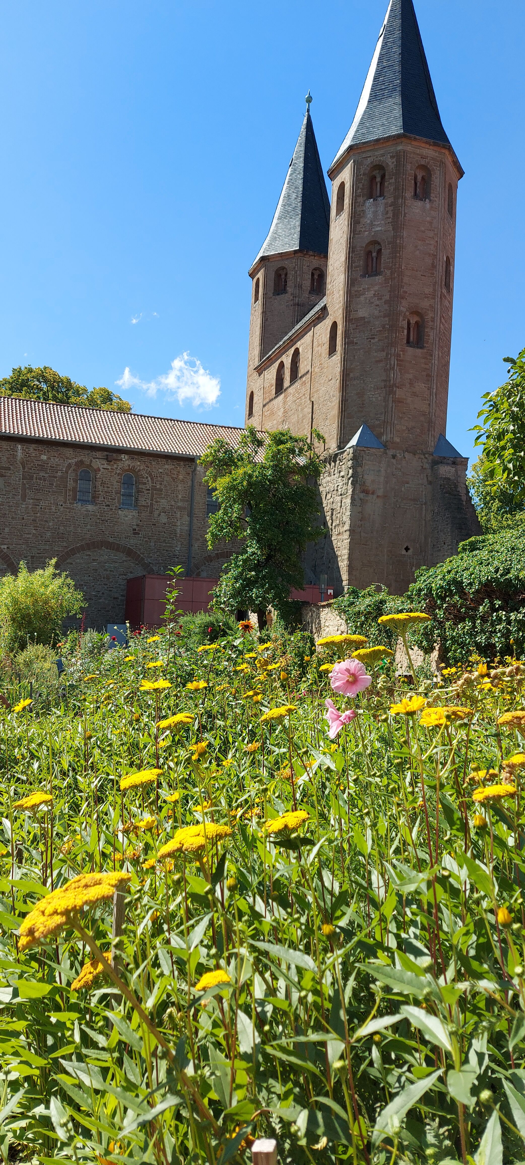 Um die angepriesene Klosterwanderung von Ilsenburg nach Wernigerode zu laufen, hatte ich den Wecker früh gestellt. Nach einem guten Frühstück ging es los: Rucksack packen, Schuhe an, Hut auf, um 7:42 Uhr den Bus Richtung Ilsenburg erwischen. Doch irgendwie war es wie verhext. Die Bushaltestelle war nicht da, wo ich sie nach Kartenlage vermutet hatte. Also bin ich Richtung Bahnhof gedackelt und habe doch auf den nächsten Bus gewartet. Dabei habe ich mir die Gegend etwas genauer angesehen: Durch die Einbahnstraßen sind die Haltestellen etwas gewöhnungsbedürftig angelegt. Aber der nächste Bus kam, das sog. HATIX-Ticket gilt. Allerdings fing es kurz vor Ilsenburg an zu regnen. Na gut, dann eben mit Schirm. Der Rucksack hat ja freundlicherweise einen Regenschutz. Auf zum ersten Kloster mit Klosterkirche. Die Kirche, die ich fand, war nicht die gesuchte, aber das Kloster samt Stempel habe ich gefunden. Trotz Baustelle! Danach ging es auch schönen Waldwegen weiter. Erst noch im leichten Regen, später im schönsten Sonnenschein. Alles noch eben, fast wie im Flachland. Nur die Beschilderung war etwas dürftig auf der Strecke. Hieß es an der einen Stelle: Kloster Drübeck 1,5 km, kam danach leider kein Schild mehr dazu. Da hatte ich wohl eine Abzweigung verpasst. Ich war nach Navi gegangen… Ok, OSM und ich hatten nicht den besten Start heute. Im Fußgängermodus ist es gewöhnungsbedürftig. Aber mit einem Kilometer Umweg (oder etwas mehr?) bin ich am Ziel angekommen. Ein Picknick im klösterlichen Rosengarten schön im Schatten war neben einem weiteren Stempel der Lohn.